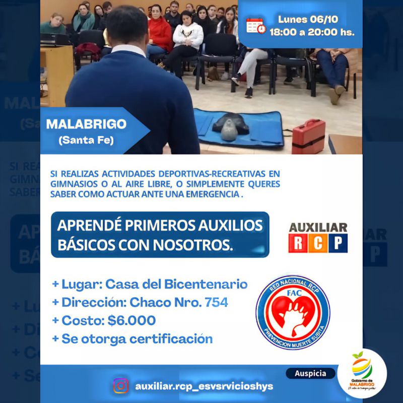 Este lunes 6 de octubre, en la Casa del Bicentenario, se dictará un curso de Primeros Auxilios Básicos y RCP, destinado a todo público y especialmente orientado a quienes realizan actividad física al aire libre o en gimnasios, con el objetivo de brindar herramientas prácticas sobre cómo actuar correctamente ante una emergencia.