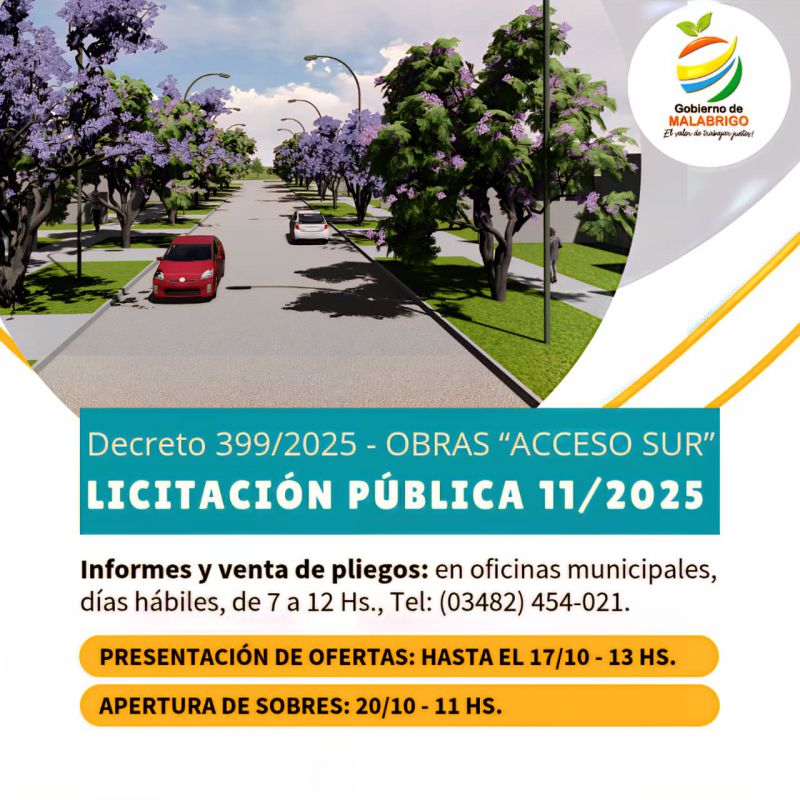 La Municipalidad de Malabrigo llama a licitación pública para obras de renovación del acceso sur a la ciudad.