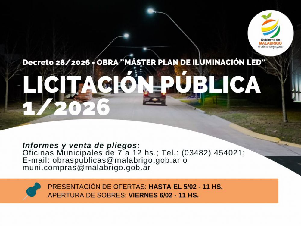 El Gobierno de Malabrigo informa el llamado a Licitación Pública N° 1/2026, establecido por Decreto Municipal N°28 del corriente año.
