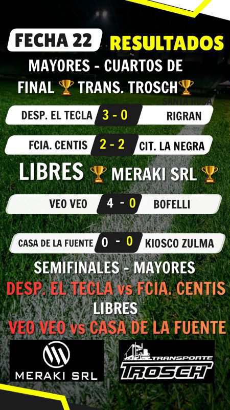 El Próximo lunes, se enfrentarán en semifinales de mayores de 35 años Despensa el Tecla y Farmacia Centis, espera en la final Metalúrgica Analex. En Libres se medirán Veo Veo y Casa de la Fuente, espera en la final carnes Canty.