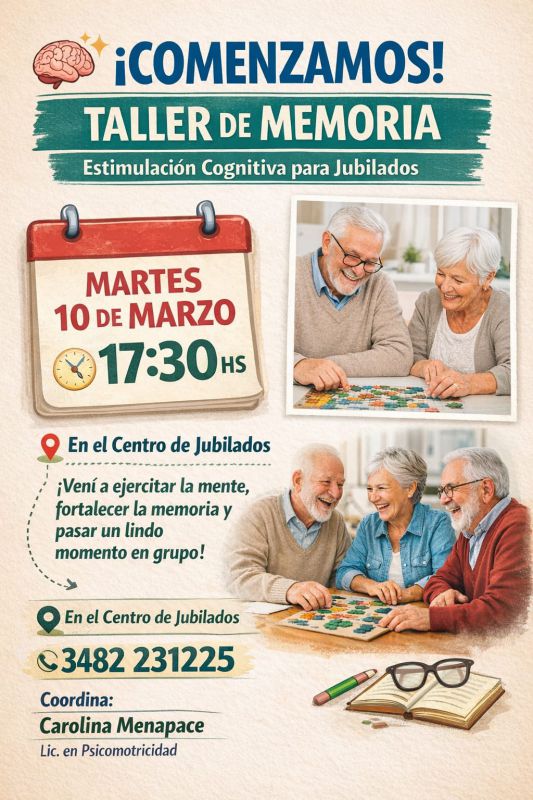 Este martes 10 de marzo a las 17:30 horas dará inicio un Taller de Memoria orientado a personas jubiladas, una propuesta pensada para estimular la actividad cognitiva y promover espacios de encuentro y socialización. La actividad se desarrollará en el Centro de Jubilados y estará coordinada por la licenciada en Psicomotricidad Carolina Menapace.